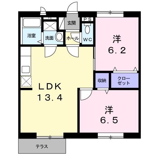 2LDK(洋室 6.2畳 洋室 6.5畳 LDK 13.4畳 ) |